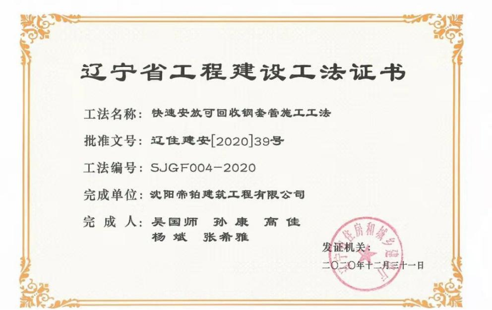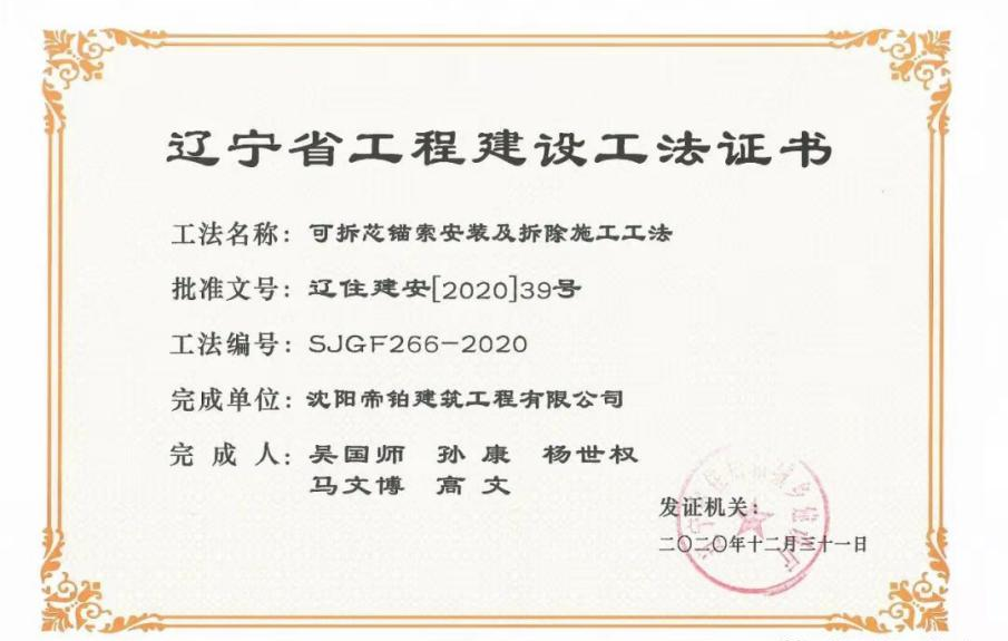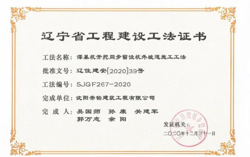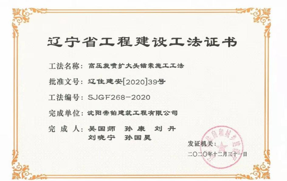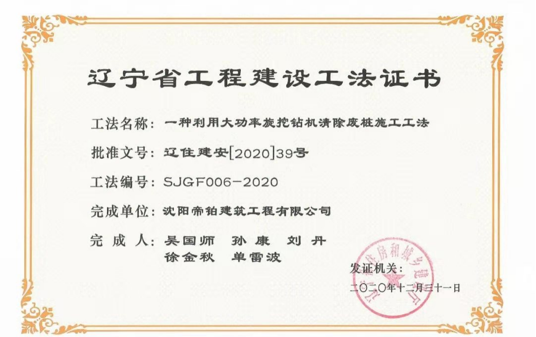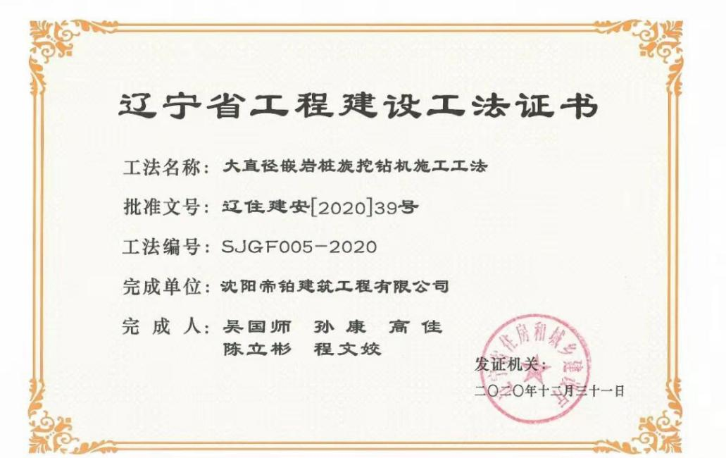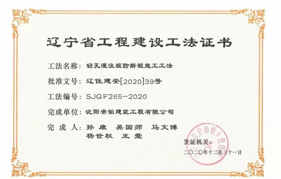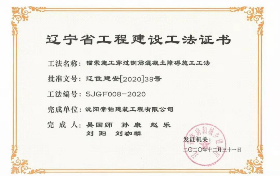 經(jīng)公司技術(shù)團(tuán)隊(duì)的不懈努力,2020年度我公司有10項(xiàng)工法被遼寧省住房和城鄉(xiāng)建設(shè)廳評(píng)定為遼寧省工程建設(shè)工法,分別為快速安放可回收鋼套管施工工法、大直徑嵌巖樁旋挖鉆機(jī)施工工法、一種利用大功率旋挖鉆機(jī)清除費(fèi)樁施工工法、一種自動(dòng)水下打撈旋挖鉆頭施工工法、錨索施工穿過(guò)鋼筋混凝土障礙施工工法、鉆孔灌注樁防斷樁施工工法、可拆芯錨索安裝及拆除施工工法、深基坑開挖同步留設(shè)坑外坡道施工工法、高壓旋噴擴(kuò)大頭錨索施工工法、深基坑越冬防凍脹施工工法。