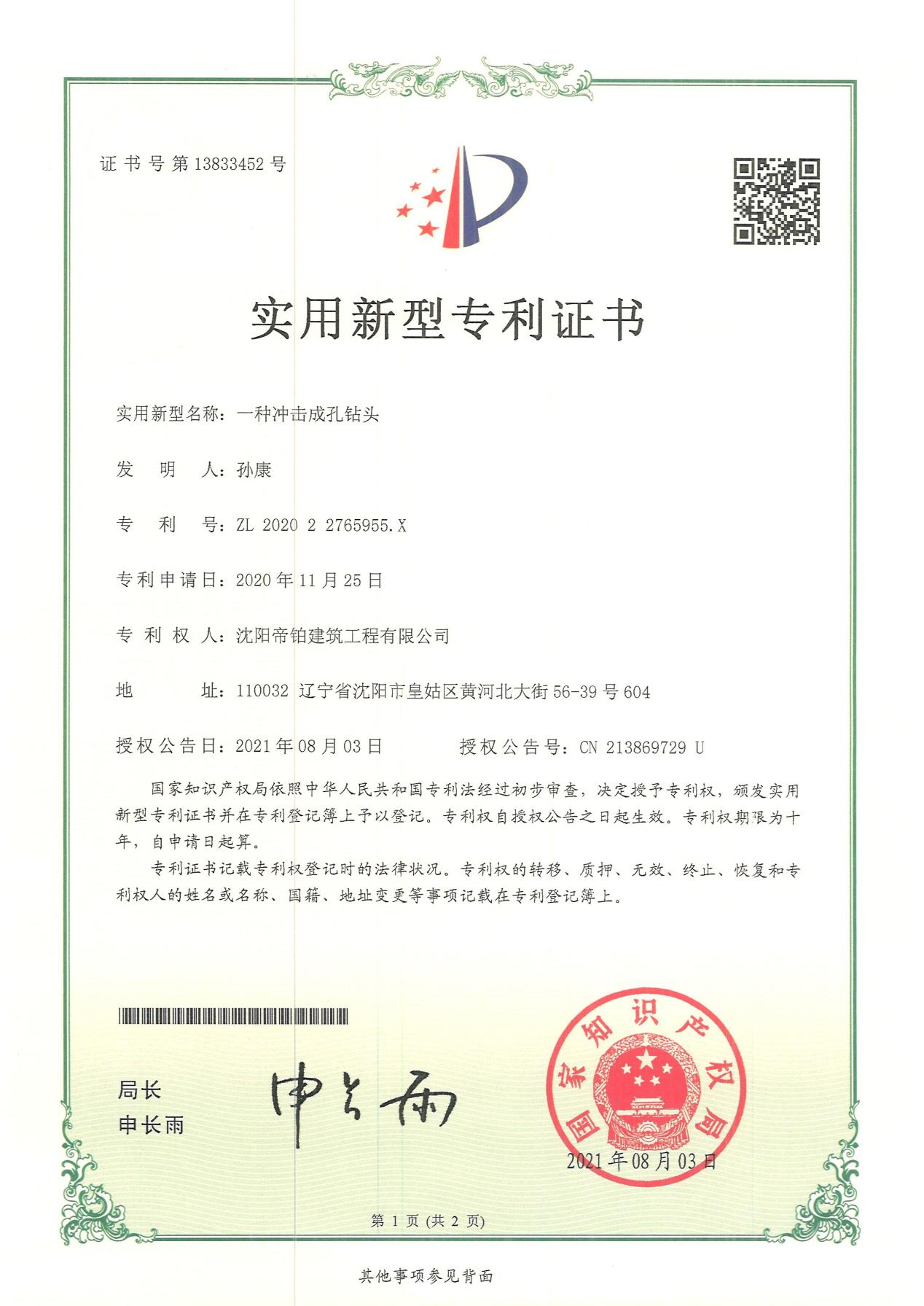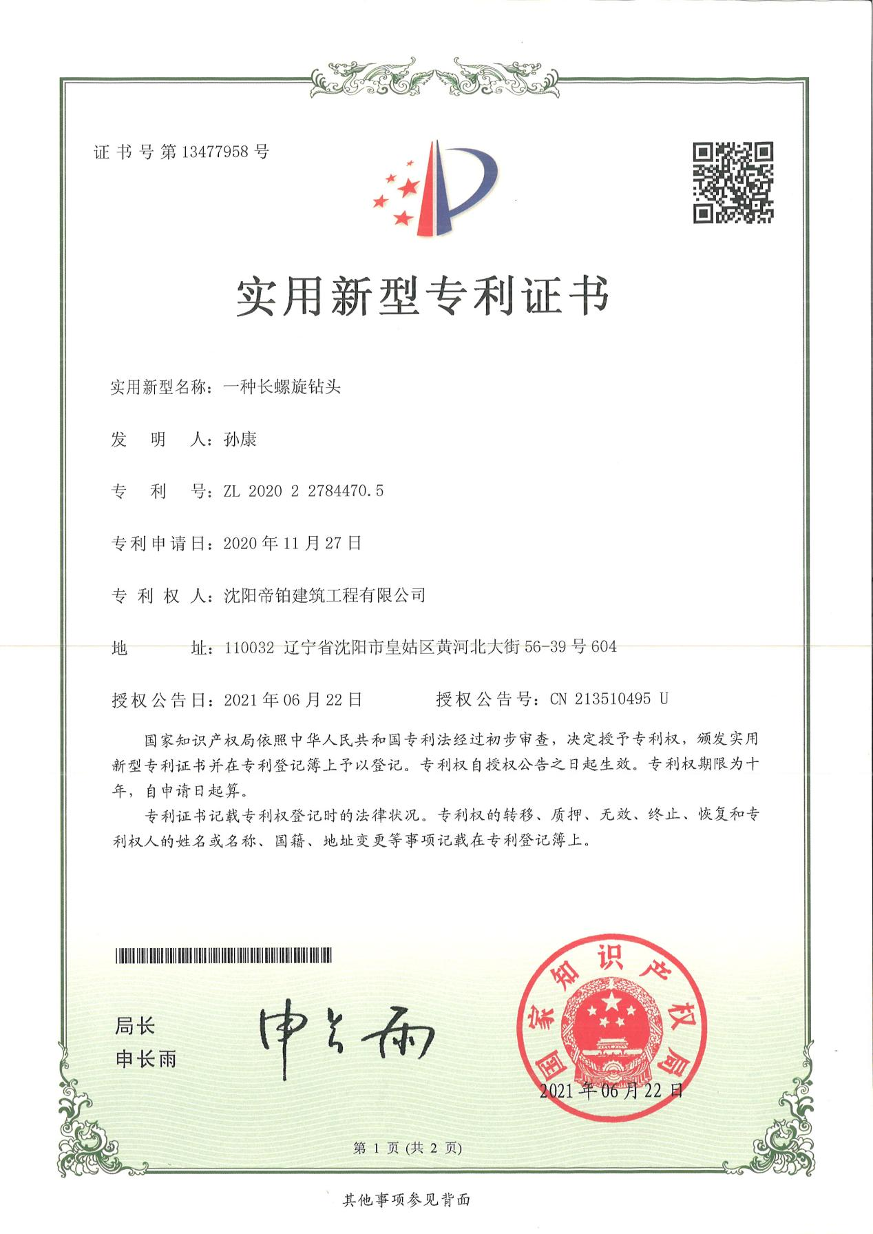 沈陽帝鉑建筑工程有限公司喜獲專利三項(xiàng)《一種沖擊成孔鉆頭》、《一種長螺旋鉆頭》、《一種調(diào)整平臺》獲得國家知識產(chǎn)權(quán)局的專利授權(quán)。上述發(fā)明是公司研發(fā)團(tuán)自主研發(fā)項(xiàng)目,主要是針對工程實(shí)際施工過程中面臨的實(shí)際技術(shù)難題,經(jīng)過研發(fā)團(tuán)隊(duì)多次試驗(yàn)最終解決問題,并積極申請國家知識產(chǎn)權(quán)保護(hù)。