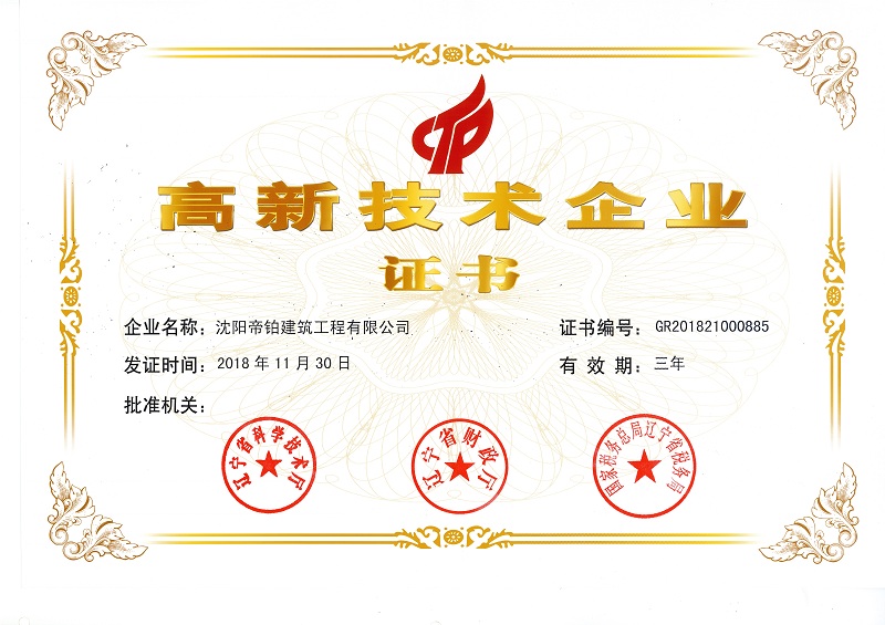 審核通過(guò),沈陽(yáng)帝鉑獲得高新技術(shù)企業(yè)榮譽(yù)稱號(hào),2019年2月遼寧省科學(xué)技術(shù)廳下發(fā)高新技術(shù)企業(yè)證書。