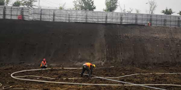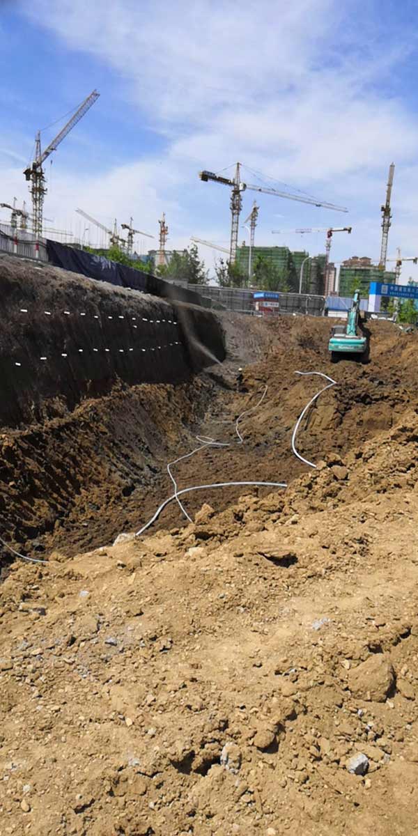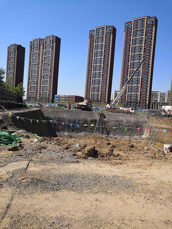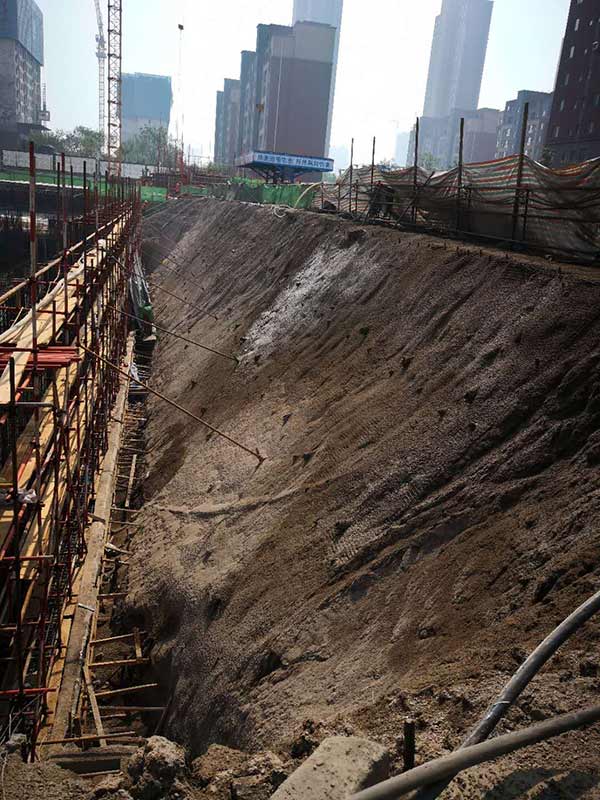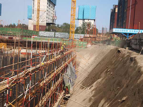 本次基坑支護(hù)施工是二期部分高層及地下停車場(chǎng)。采用樁錨+放坡素噴混凝土的支護(hù)體系,鋼管樁樁長(zhǎng)9.0m,樁間距0.5m,兩排錨索,錨索間距為1.2m。