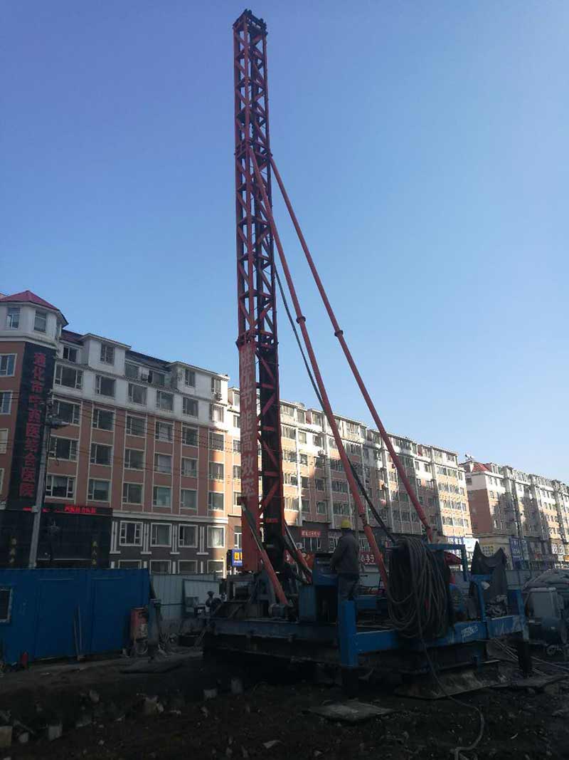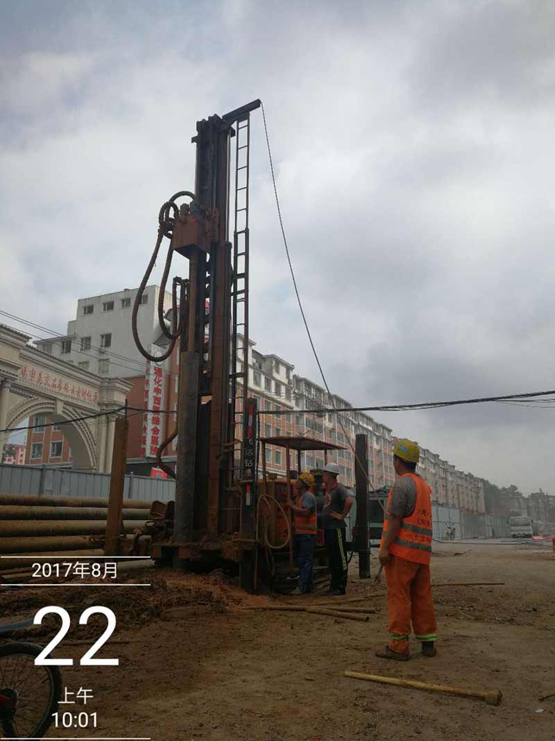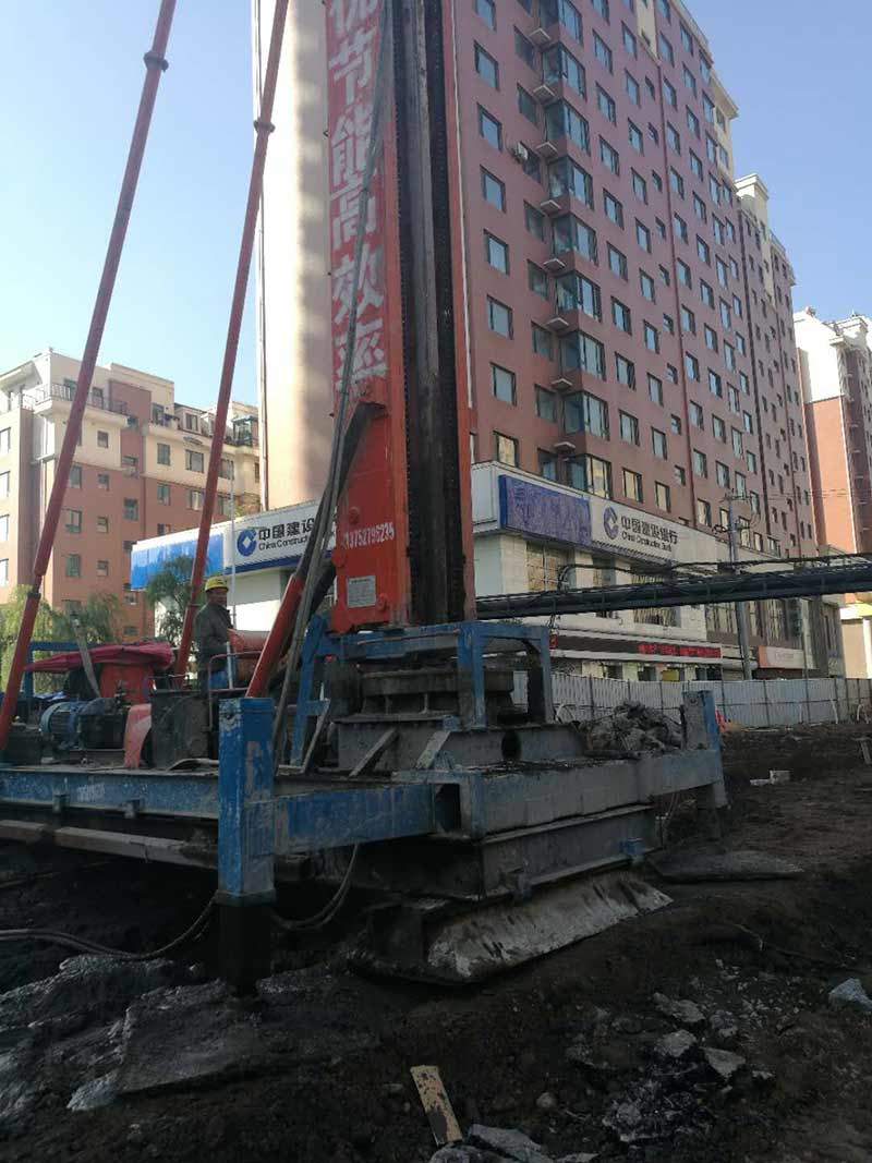 鋼管樁施工機(jī)械為長(zhǎng)螺旋改裝的大型號(hào)潛孔錘配合30m³空壓機(jī)進(jìn)行施工。鋼管樁長(zhǎng)12米,普通潛孔錘無法直接打入12米,需將12米鋼管先割斷再焊接,這樣工程進(jìn)度無法保證。長(zhǎng)螺旋改裝后的大型號(hào)潛孔錘可直接施工12米鋼管,提高施工效率。