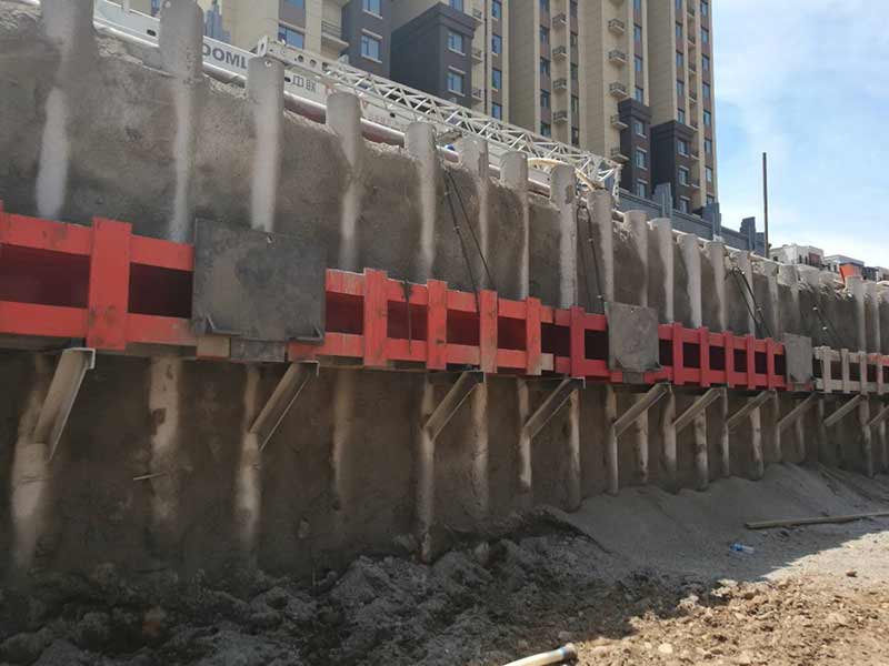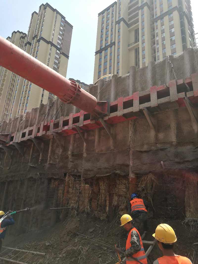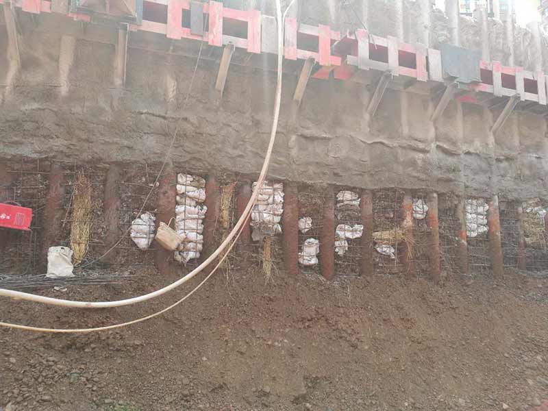 樁間噴護(hù)采用礦渣硅酸鹽水泥,標(biāo)號(hào)為P.S42.5,噴射混凝土強(qiáng)度等級(jí)為C20,噴射厚度80mm,內(nèi)置一層φ6.5@200鋼筋網(wǎng)。