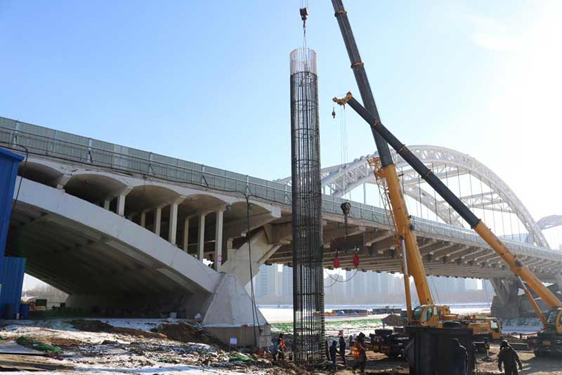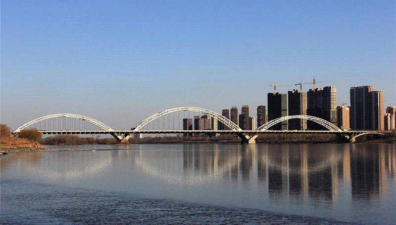 渾河長(zhǎng)青大橋位于沈陽(yáng)市東南部,橋梁由主橋和南北引橋組成,主橋?yàn)槿字谐惺戒摴芑炷凉皹?,凈跨?27.226m+147.992m+127.226m,南北引橋各為 60.95+52.502m 的空腹式鋼筋混凝土拱肋橋,橋梁全長(zhǎng) 629.348m。該項(xiàng)目的維修改造工程主要包括兩側(cè)新建橋梁和舊橋的加固維修。在舊橋左右兩側(cè)新建同跨度橋梁各一幅,橋梁每幅橋?qū)捑鶠?4.5m,跨徑布置為51.85+52.502+127.226+147.992+127.226+52.502+51.85=611.448m。