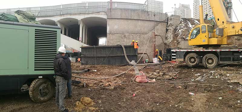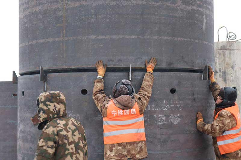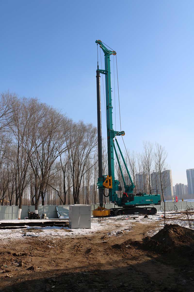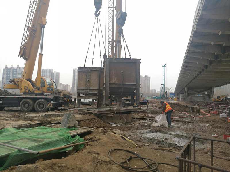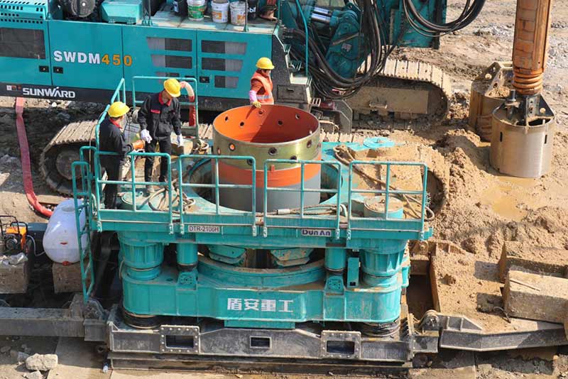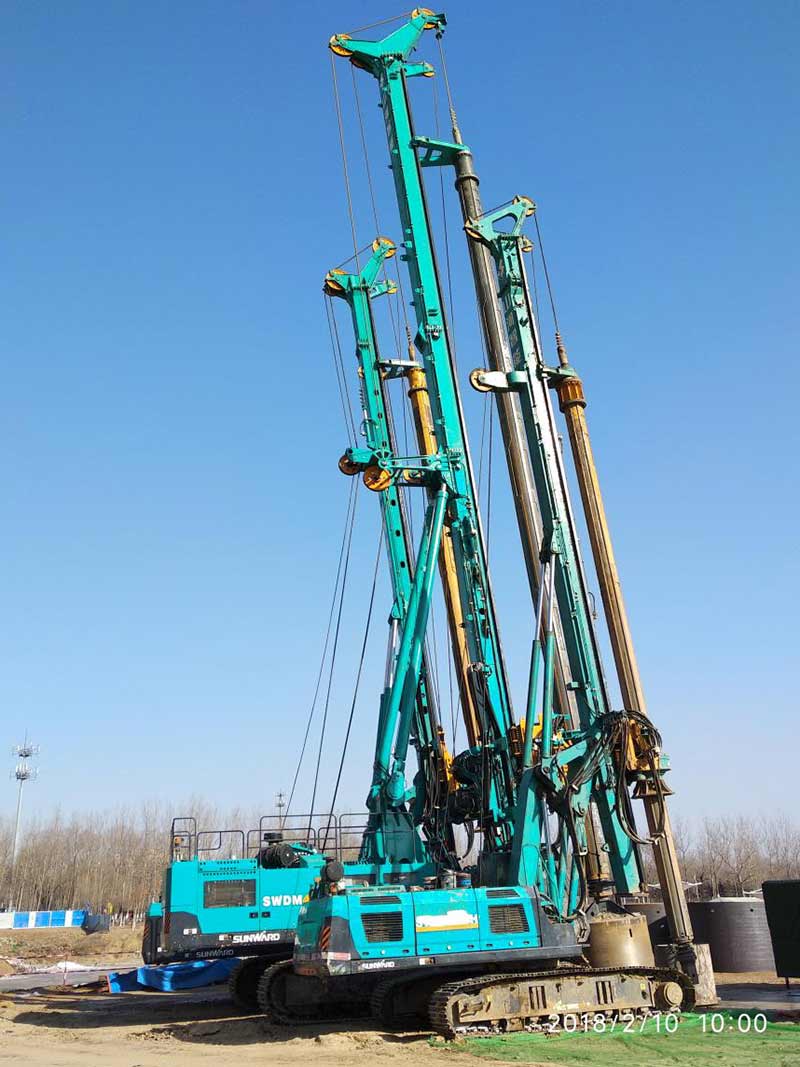 新建東側(cè)橋梁75、76承臺(tái)樁基礎(chǔ)施工前采用旋噴加固處理,旋噴樁最大深度為48米,已超過(guò)旋噴鉆機(jī)成孔極限,采用百米鉆機(jī)引孔,安放PVC塑料管,引孔完成后進(jìn)行旋噴。旋噴完成后旋挖采用擴(kuò)孔鉆頭擴(kuò)孔安放長(zhǎng)鋼護(hù)筒。