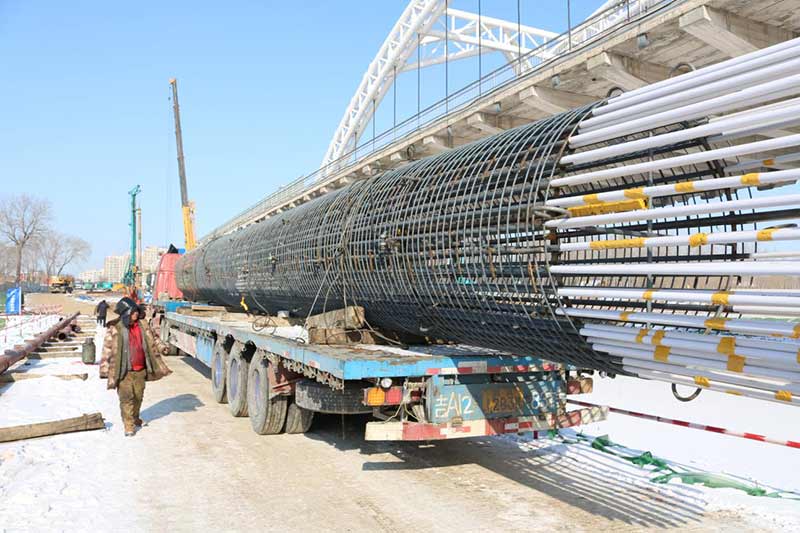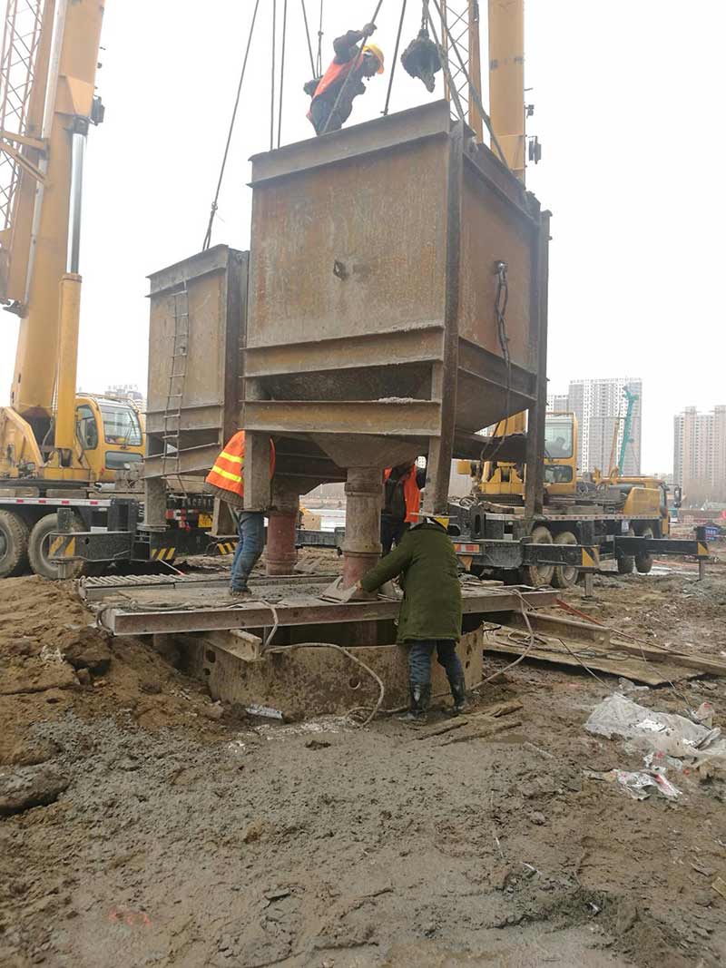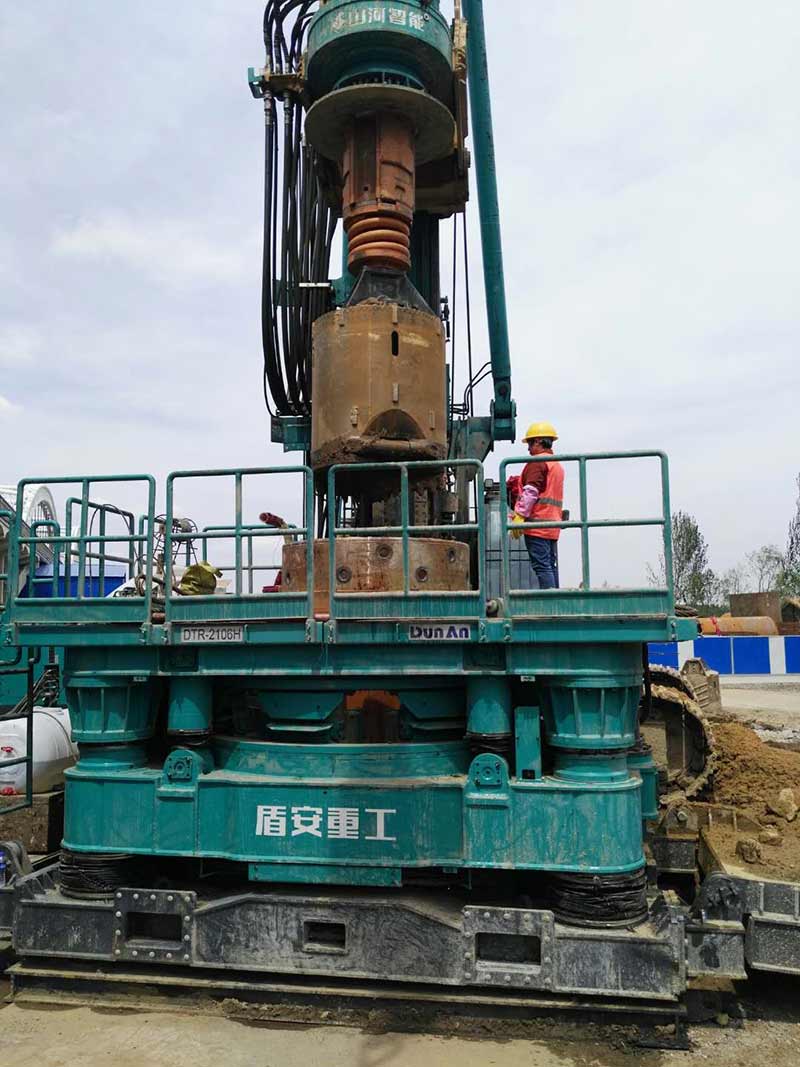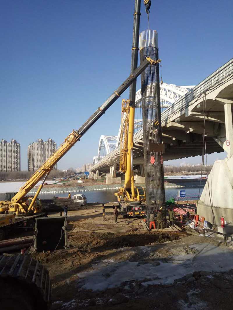 長(zhǎng)青橋新建橋梁位于長(zhǎng)青橋兩側(cè),西側(cè)樁型為摩擦樁,東側(cè)樁型為端承樁;樁基礎(chǔ)采取大直徑混凝土水下灌注樁,西側(cè)樁徑為Ф2m,東側(cè)樁徑為Ф1.5m、Ф2m、Ф2.5m、Ф2.8m,共計(jì)55根,Ф2.5m樁最深鉆孔深度達(dá)73.8m,進(jìn)入中風(fēng)化5m,Ф2.8m樁最深鉆孔深度達(dá)71.5m,進(jìn)入中風(fēng)化5.6m;其中,72#、73#、74#、75承臺(tái)在渾河中,71#、76#、77#在河岸上;東側(cè)新建橋梁距地鐵較近,為保證施工安全,在距離地鐵10號(hào)線較近處的樁采取安放鋼護(hù)筒至泥礫2.5m的保護(hù)措施,Ф2.5m,Ф2.8m樁最深鋼護(hù)筒埋設(shè)至44m,其中77臺(tái)Ф1.5m樁首次采用全回轉(zhuǎn)鉆機(jī)埋設(shè)護(hù)筒,護(hù)筒最深埋設(shè)至52m。二次清孔方式采用氣舉反循環(huán)清孔。Ф2.5m、Ф2.8m樁采用雙導(dǎo)管灌注,首灌使用2個(gè)5.7m³大料斗封底,